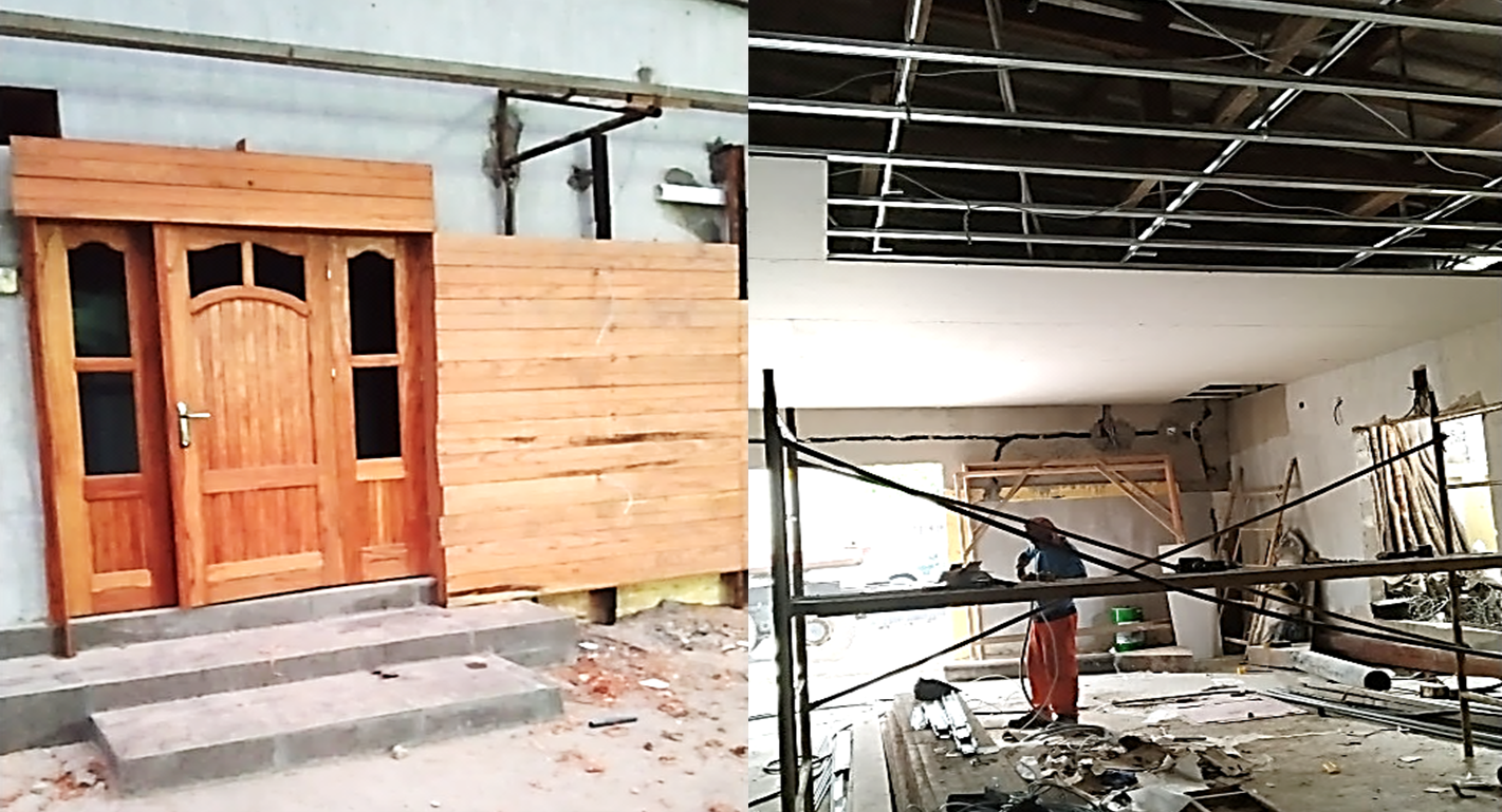 Habillage façade extérieure en bois traité, intérieure mur avec papier peint, sol avec paquet et un jardin artificiel